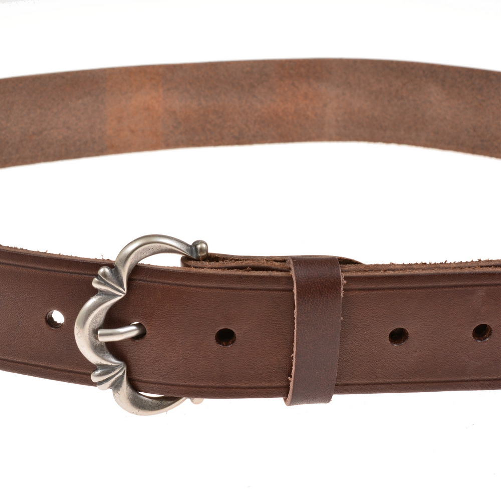 The 4 cm wide strap of this medieval leather belt is made of black or brown cowhide. The belt is available with either a silver- or brass-coloured belt buckle of zinc alloy.