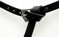 The belt is made of strong cowhide leather 3 - 3.5 mm thick in black or brown, with a silver or bronze-coloured zinc alloy belt buckle.